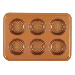 - Set of toaster-oven-sized bakeware includes two cookie pans, a cake pan, and a 6-cup muffin pan