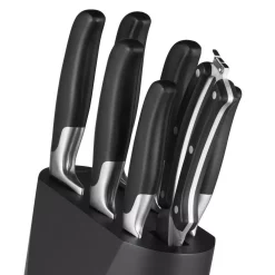This 8-piece knife block is perfect to cut, slice and dice a wide variety of ingredients with flair. The sturdy knife block in stylish black safely stores 7-high-quality knives with a hand-sharpened stainless steel blade and a black contoured handle that fit’s your hand like a glove. With the paring knife, utility knife, carving knife, bread knife, chef’s knife, santoku knife and poultry shears the set makes sure you’ve got a knife for every cooking task that’s also easy to maintain and well-balanced to ensure an optimal control. Set includes: 3.25 in. Paring Knife, 5 in. Utility Knife, 8 in. Carving Knife, 8 in. Bread Knife, 8 in. Chef’s Knife, 7 in. Santoku Knife, Poultry Shears and a Knife Block.