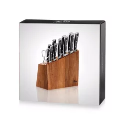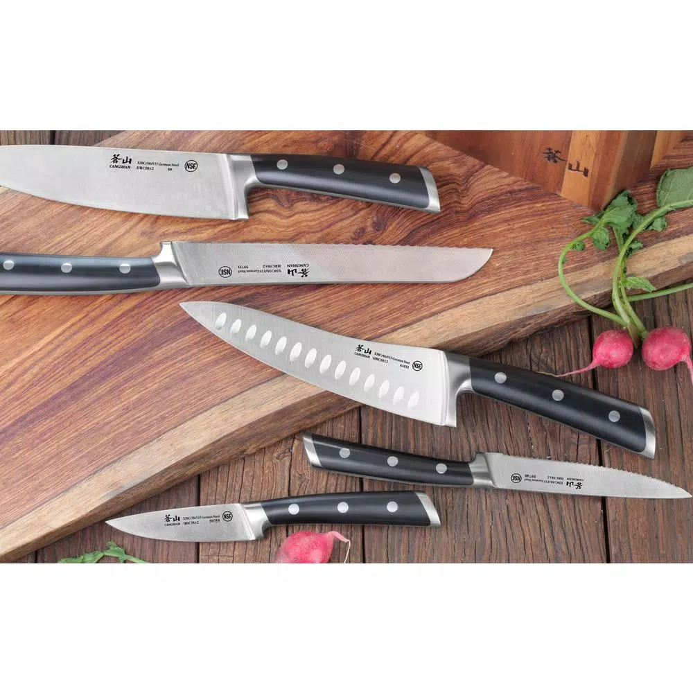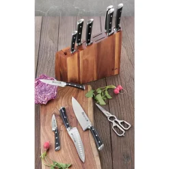 - Includes: 2.75 in. peeling knife, 3.5 in. paring knife 5 in. serrated utility knife, 6 in. boning knife, 7 in. nakiri knife, 7 in. hollow edge santoku knife, 8 in. chef’s knife, 8 in. bread knife, 9 in. hollow edge carving knife, 8 in. honing steel, Come-apart all metal kitchen shears, 11-slot solid walnut knife block, please note: Storage block is counted as an individual piece