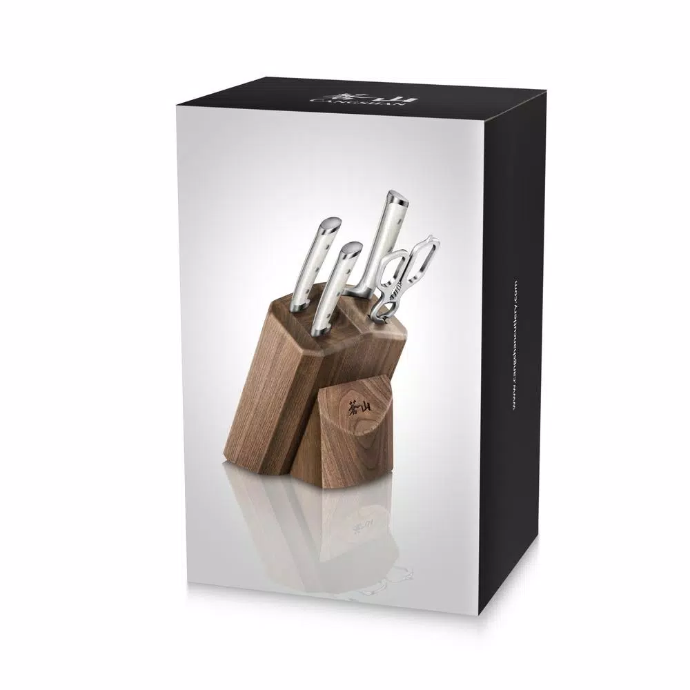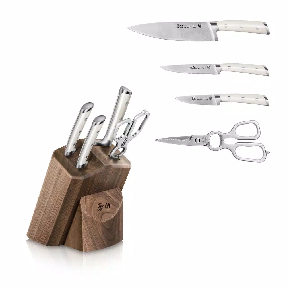 - Includes 8 in. chef’s, 5 in. serrated utility, 3.5 in. paring, 9 in. shears and walnut block