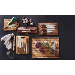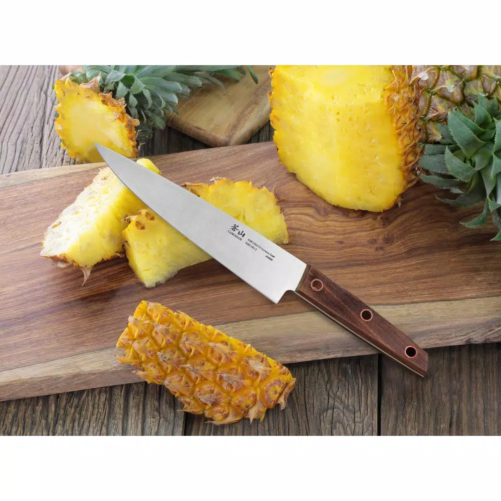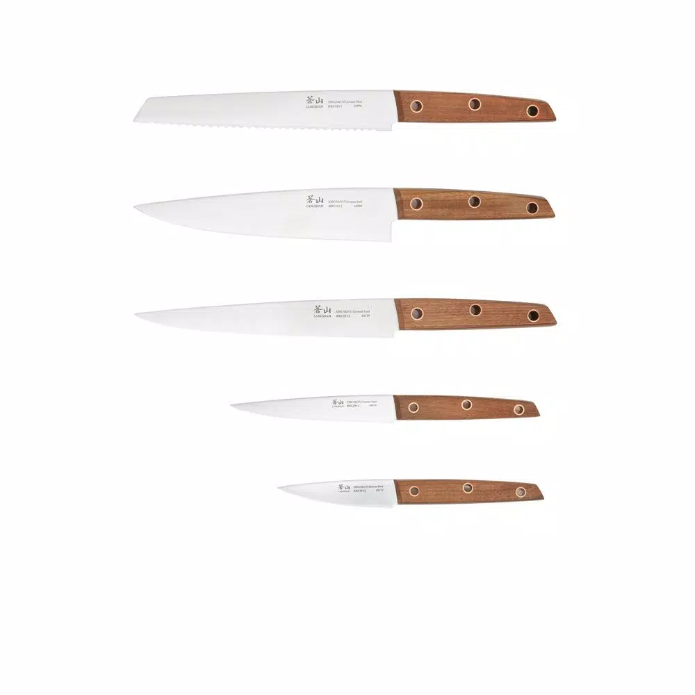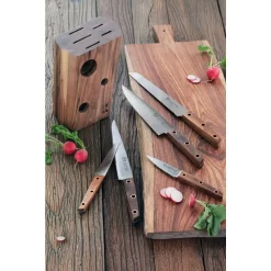 - Includes: 3.5 in. paring knife, 5 in. serrated utility knife, 8 in. carving knife, 8 in. chefās knife, 8 in. bread knife, 5-slot solid walnut knife block