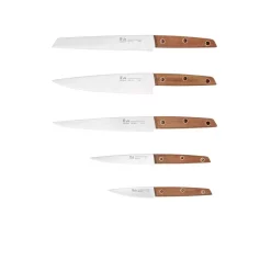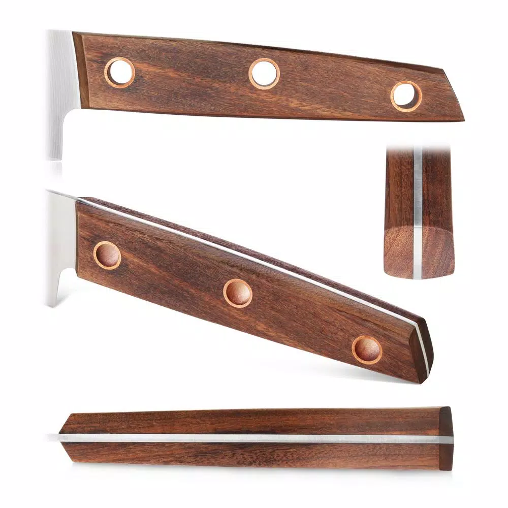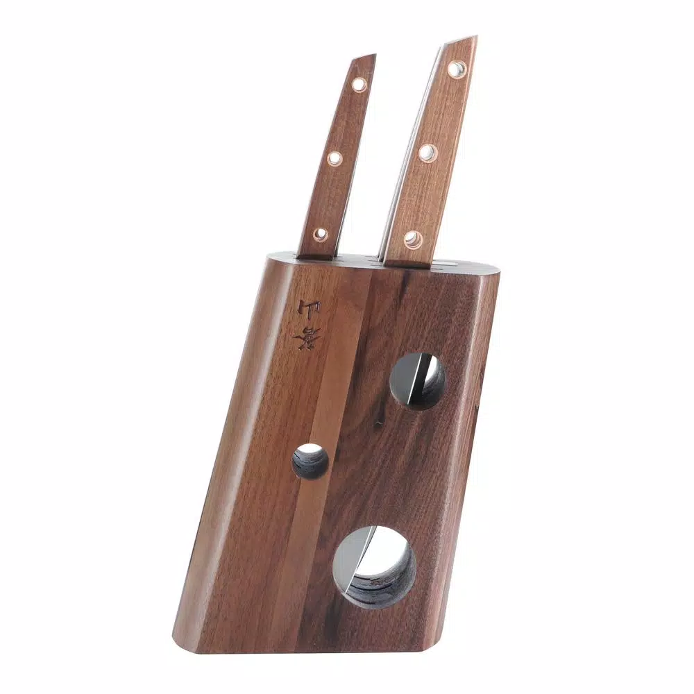 The W Series reflects the transparency, openness and harmony that allow practical function to seamlessly meld with forward-thinking aesthetics. Sharp, clear lines smoothly meld into the subtle, soft contours of the elegantly crafted German Steel knives while distinct hollow brass rivets cut through the full tang of the blade vividly emphasizing and perfectly matching knife and chef. Dark, lush walnut wood textures and the elegant lines of the W Series Knife Block gracefully elevate and emphasis the unique beauty of the W Series Knife Set.