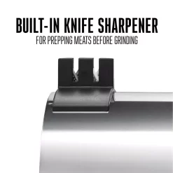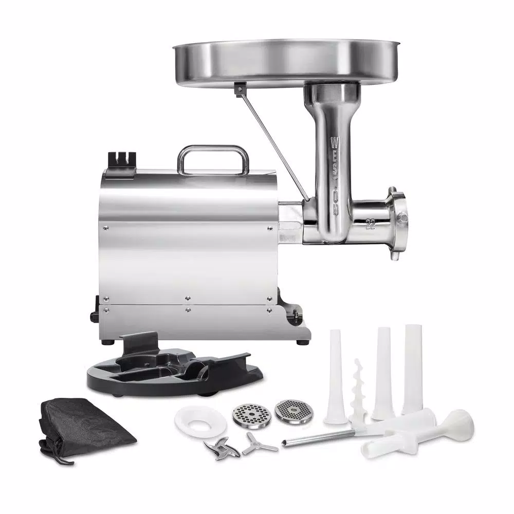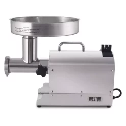 Weston Pro Series Meat Grinders are perfect for the hunter or home chef who need a machine with unmatched performance, quality and durability. Grind 4 – 6 lbs. of fresh meat per minute and make sausages easily with the Weston #8 Electric Meat Grinder and Sausage Stuffer. Why is ours better, Speed: an extra wide, offset throat with rifled head design makes ours the fastest grinders on the market. Durability: We use all metal, precision engineered gears for quiet performance and rugged durability. Dependability: A permanently lubricated, air-cooled motor keeps running smooth for a lifetime of use. Our new oval tray design enables you to load meat quickly into the grinder, and we’ve added a built-in knife sharpener to keep your butcher knives ready for efficient slicing. Includes an auger grabbing stomper, nested storage tray for the accessories, a tray cover, two stainless steel plates, a stainless steel grinding knife, and a sausage stuffing kit with adapter, spacer, three sausage funnels and a snack stick funnel.