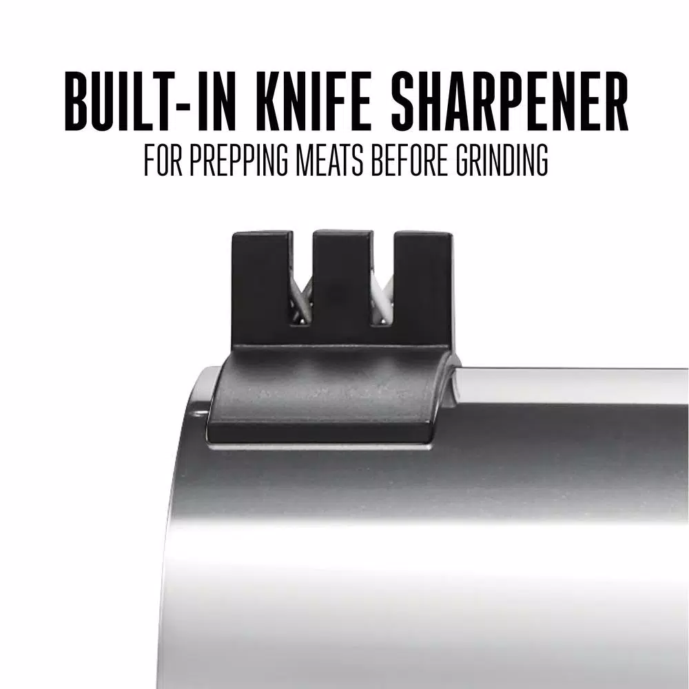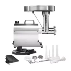 - Includes stainless steel grinding knife, 2-stainless steel grinding plates for coarse (7 mm) and medium (4.5 mm) grinds, a sausage stuffing kit with 3-funnels (20 mm, 30 mm, 40 mm), a 10 mm snack stick funnel, adapter and spacer