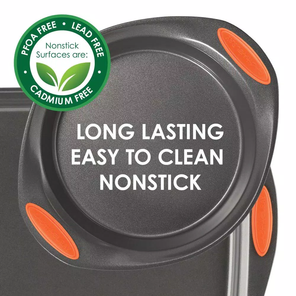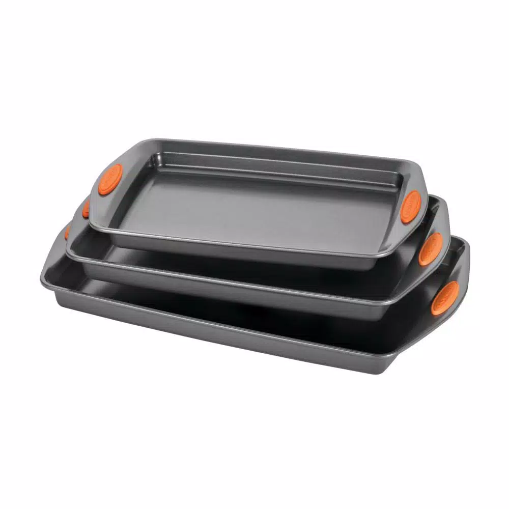 Offering three popular-sized baking pans, the Rachael Ray Yum-o! Nonstick Bakeware 3-Piece Oven Lovin’ Cookie Pan Set is ideal for making both savory and sweet treats. These cookie pans are made from durable carbon steel that resists warping and feature long-lasting nonstick that provides excellent food release and easy cleanup. With a small, medium, and large cookie sheet, enjoy the convenience of three sizes to do everything from roasting stuffed eggplant, broiling cheesy garlic bread, or baking Rachael’s Ranch-Style Potato Skins and yummy Kahlua Chocolate Chunk Cookies. The cookie pans’ bold-colored, extra-wide grippy handles provide a confident grasp when pulling items from the oven, and they are oven safe to 450°F. As an added bonus, a portion of the proceeds from this purchase goes to Yum-o!, Rachael’s nonprofit organization that helps kids and their parents develop healthy relationships with food and cooking. These versatile cookie pans are the perfect complement to many other pieces in Rachael’s bakeware and cookware collections that always spell fun in the kitchen. Hit a sweet or savory triple, with the Rachael Ray Yum-o! Nonstick Bakeware 3-Piece Oven Lovin’ Cookie Pan Set that includes three durable pans for creating delish baked foods.